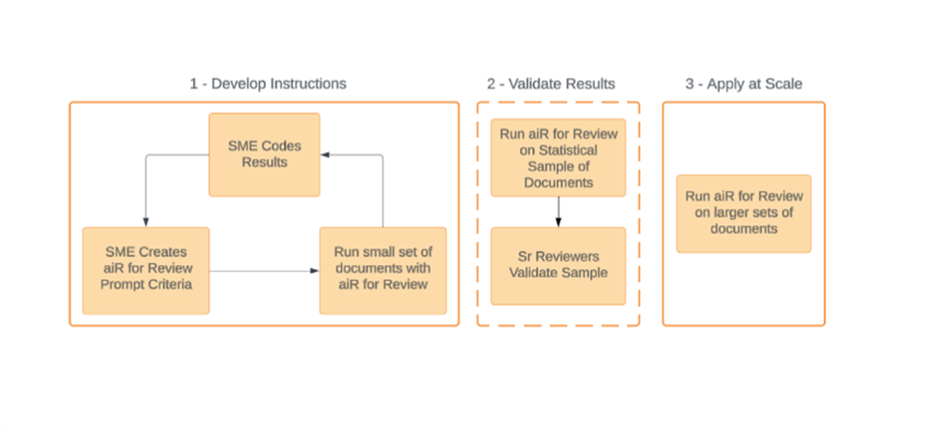 While leaning on industry-standard validation can supply your confidence in the technology, the real contribution of generative AI to the topic of validation is when it happens. Generative AI enables legal professionals to validate performance before running a full review, allowing you to run statistically validated prompts from smaller document sets with the input of subject matter experts and senior reviewers across larger sets of documents. When we apply this concept to Relativity aiR for Review, the workflow looks like this: