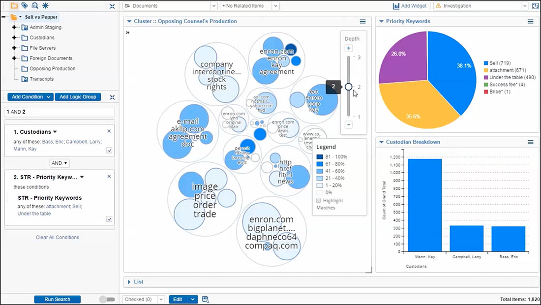 For example, say you wanted to dig into a group of conceptually related documents—a cluster—and learn the breakdown of custodians, key terms, and even your team’s coding decisions on those documents. Data visualization widgets for your custodians, terms, and coding decisions paired with a cluster visualization widget can help.